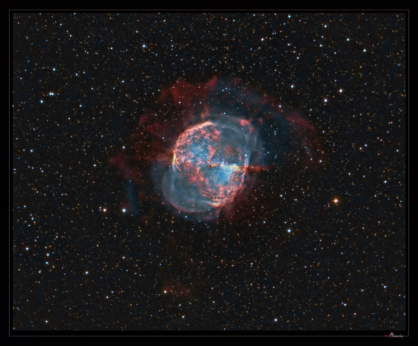 The Dumbbell Nebula (also known as a Messier 27, M 27, or NGC 6853) is a planetary nebula in the constellation Vulpecula, at a distance of about 1360 light years. It has a large angular diameter as a planetary nebula, about 8 x 5,6 arc minutes. (Rarely imaged outer halo is not included, it can be seen in my image. With an outer shell, the diameter is over 15'' (more than a size of the half a Moon))